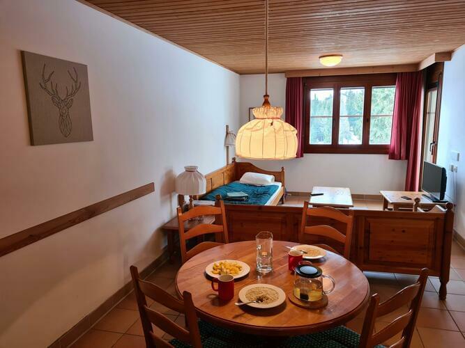 It can be booked for single use and up to a maximum of four people. The bedroom has a large double bed and is separated from the living room. In the living area there are two additional pull-out sofa beds, which can also be used as a double bed. The bed linen is provided. The small kitchen is integrated into the living room with a cooker, refrigerator, freezer, kettle and coffee maker. The bathroom is classically equipped with a spacious washstand and WC. The holiday flat has a sunny terrace with an unforgetable view!