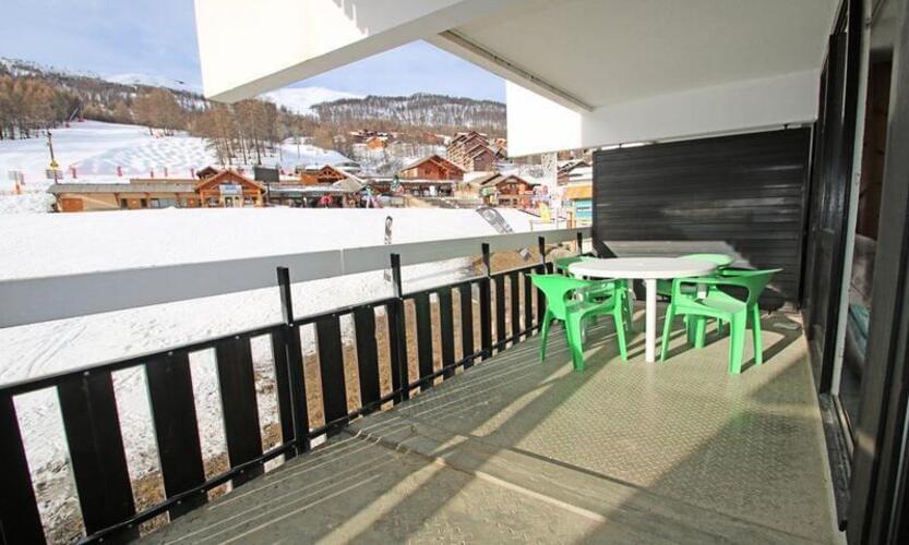 Pogled na smučišče brez nasprotne strani, velik balkon na jugu s mizo in stoli.