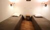 - Ležišča: ena spalnica z zakonsko posteljo in ena kabinska soba z dvema ločenima posteljama in policami za shranjevanje. Postelje opremljene z odejami