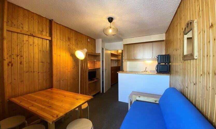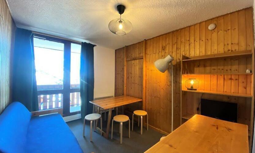 Ta studio velikosti približno 20m2 je obrnjen proti jugu z lepim razgledom na gore in območje Val Thorens s svojega balkona.